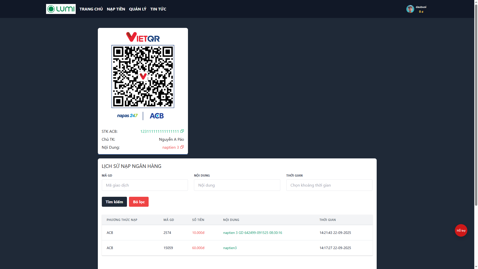 Code này share free ở đâu đó (bạn muốn tự tìm) và đã được lấy về để sửa lại thêm chức năng nạp tiền qua ngân hàng giá 1k/ngày